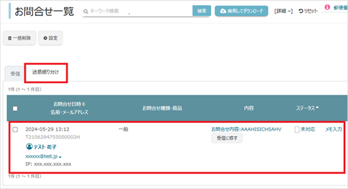 連続した送信や特定のメールアドレス、文言を含む問合せを迷惑メールとして振り分けできます。