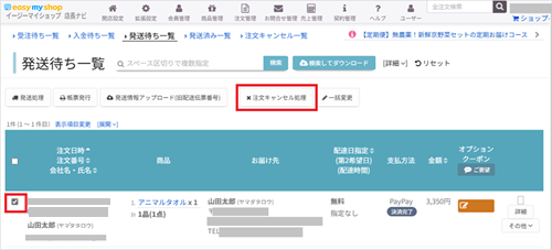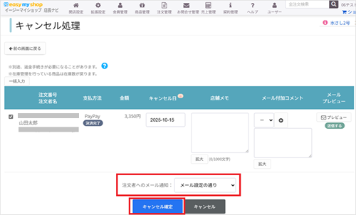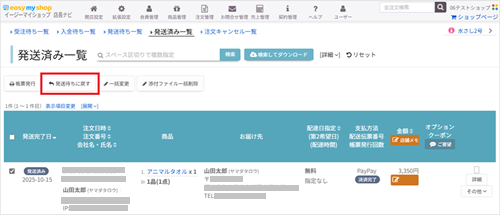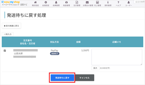 取消処理により当月のイージーペイメント売上額(翌月末入金予定額)から差し引かれたことで、当月に発送処理(決済確定)をした注文を「発送待ちに戻す」ができなくなる場合がございます。