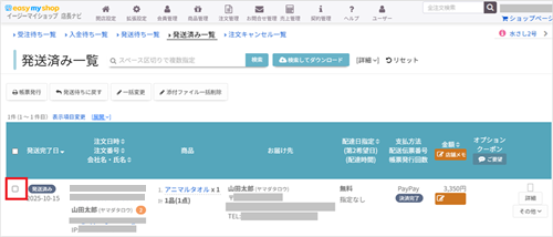 注文管理>発送済み一覧で該当の注文の[詳細]を開きます。