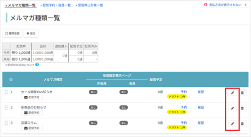 受信可否を受け付けるメルマガ種類の[編集(鉛筆マーク)]を開きます。